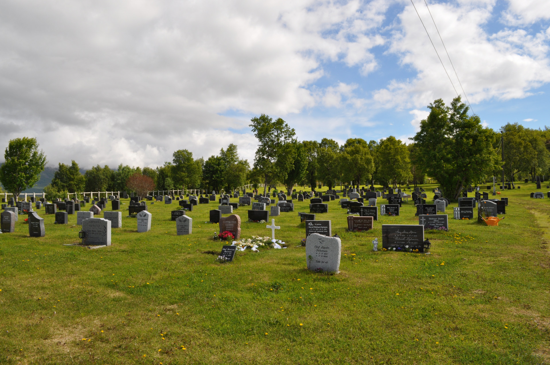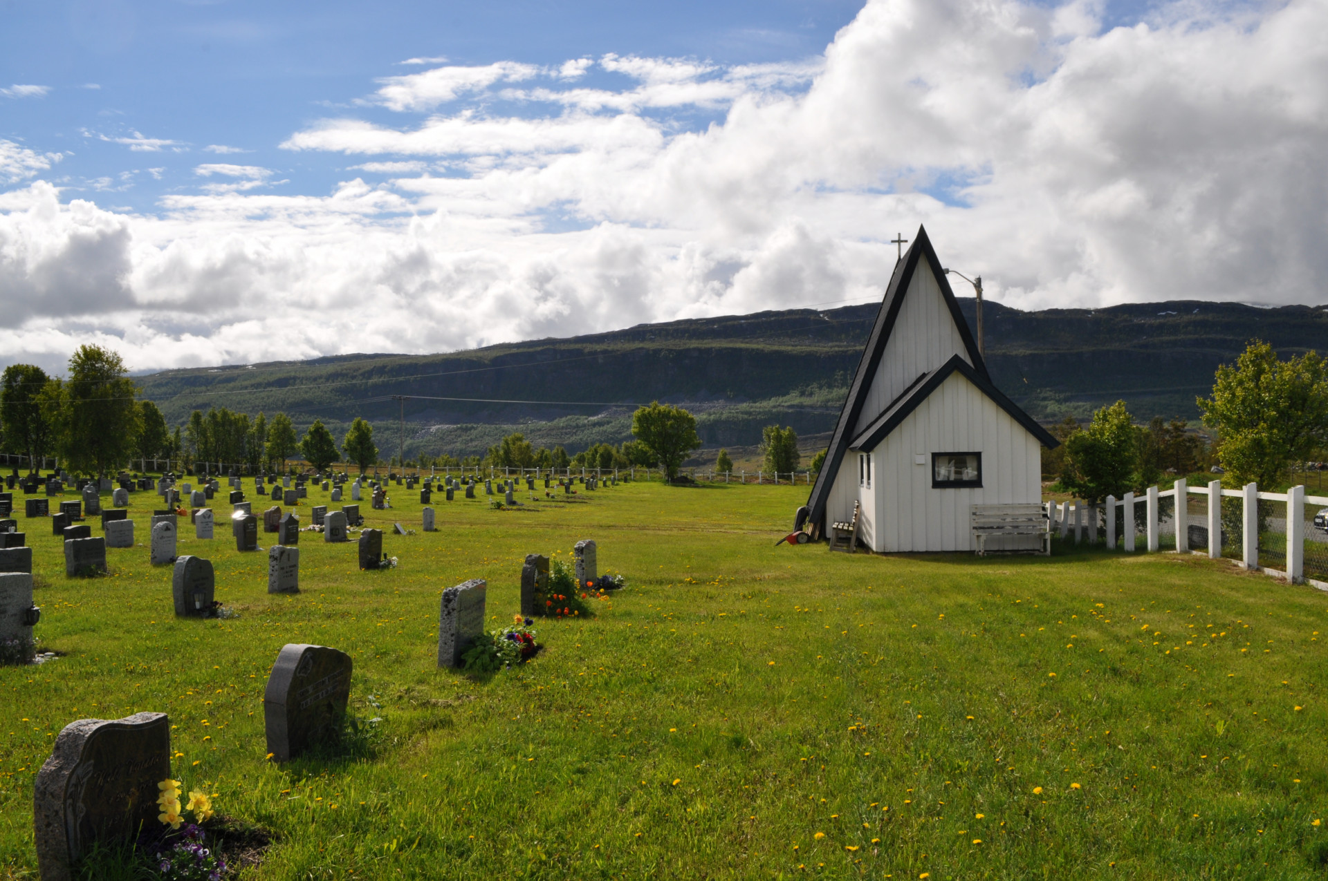 Wiejski cmentarz w miejscowości Nordstraumveien, przy drodze numer 6 w kierunku North Cup. Typowa stylistyka skandynawska, skromne groby, poszanowanie zmarłego i natury. Charakterystyczne dla regionu ozdoby, statuetki i reliefy gołębi. Autor zdjęć Jan Sz. Czerwiec 2019r.