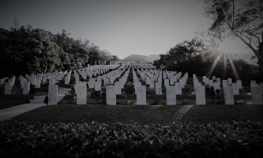 War memories symbol. The Sai Wan War necropolis is located in the southeast of Hong Kong. Built in the first half of the 20th century. The cemetery commemorates the soldiers and officers of the Hong Kong garrison who died during the First and Second World Wars. The remains were cremated according to their religious customs and their names were written on the plaques. In total, there are more than 2,000 graves in the cemetery in 2020 y., of which about 500 are unknown. Mostly British, Canadian, Dutch and Indian soldiers were buried here.